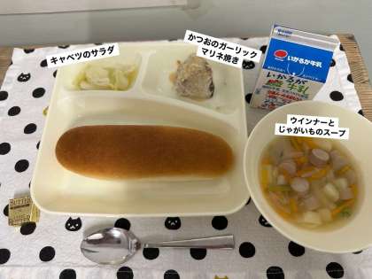 今日の献立は、かつおのガーリックマリネ焼き[ノンエッグドレッシング]、ウインナーとじゃがいものスープ、キャベツのサラダ、大型コッペパン、バター、牛乳です。