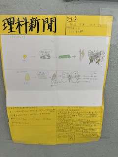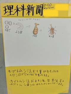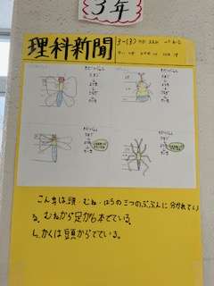 3年理科では、学習したことをまとめる理科新聞を作っています。今回のテーマは、チョウの体のつくり、チョウの育ち、カブトムシの育ちをテーマにしました。理科係を中心に素晴らしい新聞ができました。3階の習熟教室(理科で使っている)前に掲示しました。3年生や4年生が興味深く見て読んでいました。