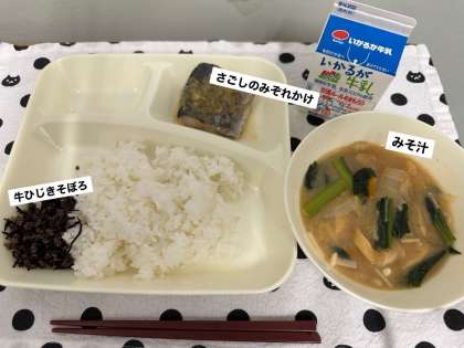 今日の献立は、さごしのみぞれかけ、みそ汁、牛ひじきそぼろ、ごはん、牛乳です。