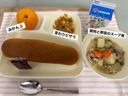 今日の献立は、豚肉と野菜のスープ煮、変わりピザ、みかん、大型コッペパン、いちごジャム、牛乳です。