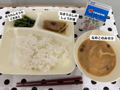 今日の献立は、なまりぶしのしょうが煮、なめこのみそ汁、ほうれんそうのごまあえ、ごはん、牛乳です。