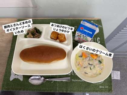 今日の献立は、はくさいのクリーム煮、あつあげのピリ辛じょうゆかけ、豚肉とさんどまめのオイスターソースいため、黒糖パン、牛乳です。