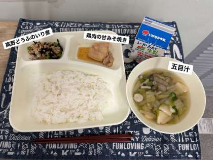 今日の献立は、鶏肉の甘みそ焼き、五目汁、高野どうふのいり煮、ごはん、牛乳です。