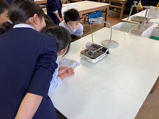 4年理科では、「もののあたたまり方」の学習をしています。予想を立てた後、実験をしました。それぞれの役割で協力しながら安全に実験ができました。結果をもとにグループで考えて、ホワイトボードにまとめ発表することもできました。その後、子どもたちからのリクエストで金属の棒(銅)をアルミニウム、鉄に変えて実験をしました。また金属の板がくりぬかれているものを使っての実験もしました。