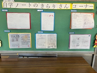 1月分の自学ノートを玄関に掲示しました。3学期に入って、どの学年も自学ノートを工夫してまとめていて素晴らしいです。日常で不思議に思ったこと、例えばしゃっくりがどうして出るのかを調べていたり、現在学習している算数の学習や百人一首のことを復習していたりと学びを深めています。
