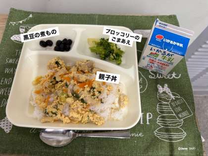 今日の献立は、親子丼、ブロッコリーのごまあえ、黒豆の煮もの、牛乳です。