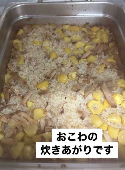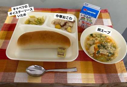 今日の献立は、中華おこわ、卵スープ、キャベツのオイスターソースいため、大型コッペパン、バター、牛乳です。