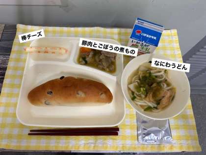今日の献立は、豚肉とごぼうの煮もの、なにわうどん、棒チーズ、レーズンパン、牛乳です。