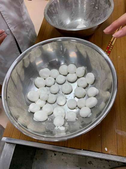 ある程度固まってきたら、団子の丸い形に作り、火が通りやすいように真ん中をくぼませました。そして、沸騰させた湯で煮ました。