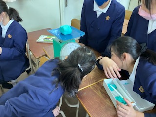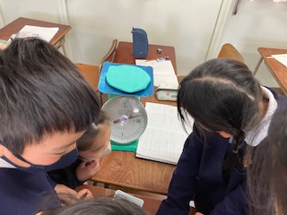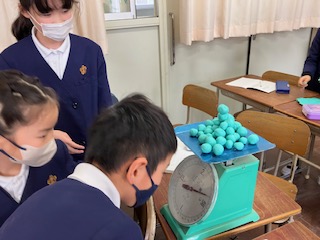 3年理科では、「ものの重さ」の学習をしています。同じ重さの粘土を使って、丸の形、皿のような形、団子のような形、四角の形に形を変えると重さはどうなるのかを調べました。実験が終わると「楽しかったー」と言っていた児童もいました。