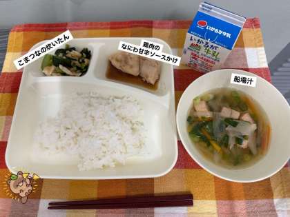 今日の献立は、・鶏肉のなにわ甘辛ソースかけ・船場汁 ・こまつなの炊いたん