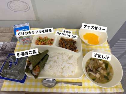 今日の献立は、手巻きご飯(牛肉のコチジャンいため、さけのカラフルそぼろ)、すまし汁、ダイスゼリー(みかん)、牛乳です。