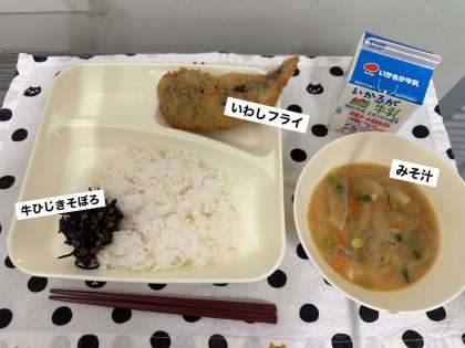 今日の献立は、いわしフライ、みそ汁、牛ひじきそぼろ、ごはん、牛乳です。