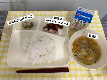 今日の献立は、鶏肉のみそバターソース、五目汁、きな粉よもぎだんご、ごはん、牛乳です。