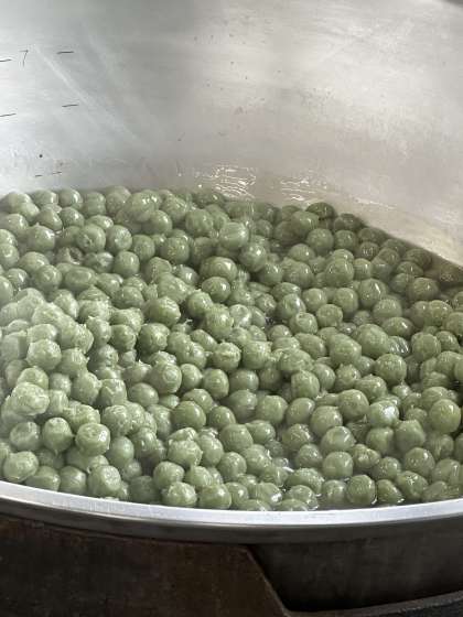 今日の給食のよもぎだんごは、うるち米ともち米、よもぎで作られています。砂糖、うすくちしょうゆ、湯を合わせて煮、でん粉でとろみをつけた甘いみつをからめたよもぎだんごに、きな粉をかけて食べます。