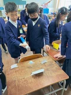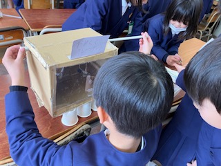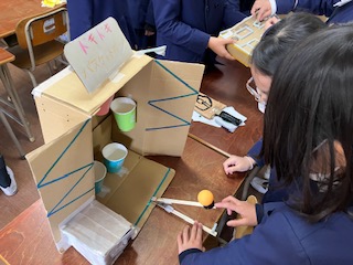 3年理科では、1年間学んできたことを活かして、おもちゃを製作しています。計画書を書き、材料を集め、試行錯誤しながら製作しています。本日は、3年1組さんが自分たちが作ったおもちゃで遊びました。磁石の引きつけ合う力を利用して、UFOキャッチャーのようなおもちゃを作ったり、空気鉄砲を作ったり、ゴムの元に戻る力を使って玉入れゲームを作ったり、磁石で動く車を作ったりと工夫がたくさんの素晴らしい作品ができました。みんな楽しく仲良く笑顔で活動できました。