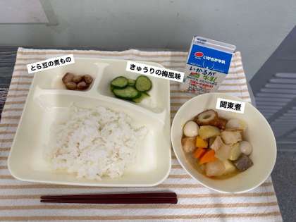 今日の献立は、関東煮、きゅうりの梅風味、とら豆の煮もの、ごはん、牛乳です。