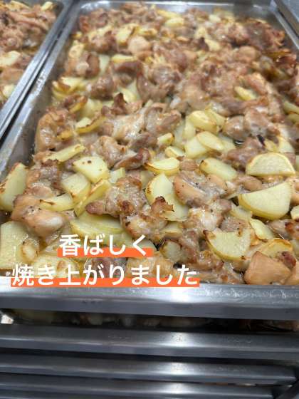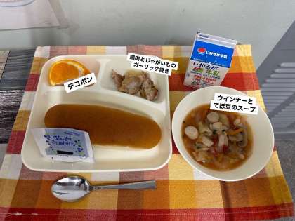 今日の献立は、鶏肉とじゃがいものガーリック焼き、ウインナーとてぼ豆のスープ、デコポン、大型コッペパン、ブルーベリージャム、牛乳です。