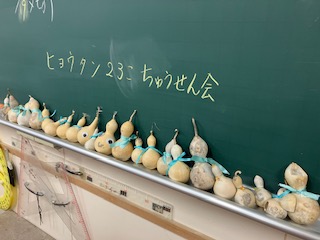 4年理科では、1年間育てたヒョウタンが24個できました。そのうちの1個は、次の4年生に見てもらうということで、残りの23個を抽選会で希望する児童に分けることにしました。色を好きなように塗りたいとか、穴を開けてランプのようにしたいとか、家の置物として置きたいとか、色々希望がありましたのでそのままの状態で渡すことにしました。抽選会当日は、80人ほど集まり、山口先生とのジャンケン大会で当選者を決めました。ジャンケン大会は盛り上がり、勝った児童は大切そうに持ち帰り、負けた児童も種をもらって家でも育てると意気込んで帰りました。ヒョウタンは、末広がりの形をしていることから、日本古来より『除災招福』『魔除け』の縁起物とされているそうです。どうぞ大事にしてくさい。