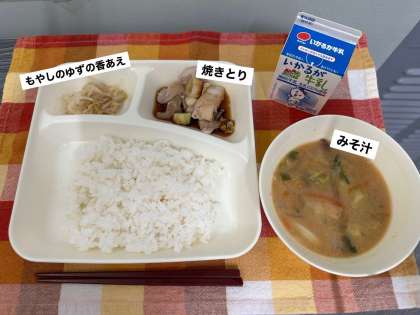 今日の献立は、焼きとり、みそ汁、もやしのゆずの香あえ、ごはん、牛乳です。
