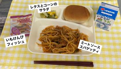 今日の献立は、ミートソーススパゲッティ、レタスとコーンのサラダ、いもけんぴフィッシュ、ミニコッペパン、牛乳です。