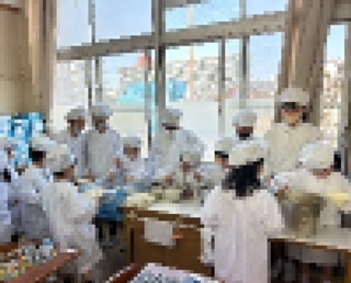 6年生のみなさんに助けていただきながら、給食当番の練習ができました。
