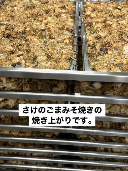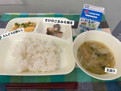 今日の献立は、さけのごまみそ焼き、五目汁、えんどうの卵とじ、ごはん、牛乳です。