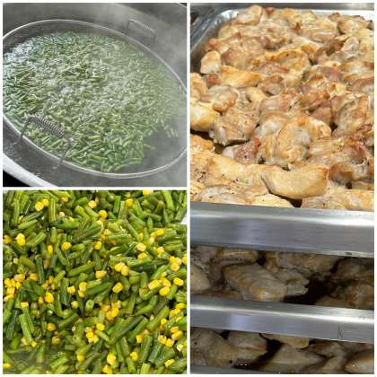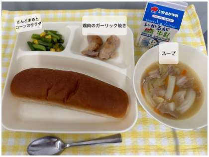 今日の献立は、鶏肉のガーリック焼き、スープ、さんどまめとコーンのサラダ、黒糖パン、牛乳です。