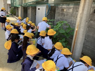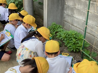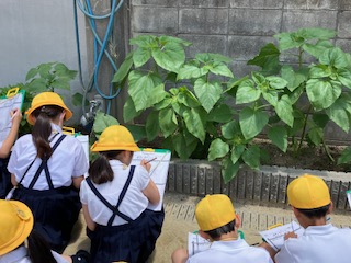 3年理科の「植物の育ちとつくり」の学習をしています。学習園で育てているヒマワリ、ホウセンカを観察しました。葉の形や草たけ、触感や、匂いなどを細かく調べて、スケッチを描きました。真剣な眼差しで一生懸命記録をとっていました。