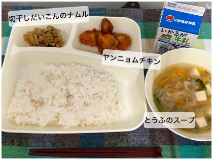 今日の献立は、ヤンニョムチキン、とうふのスープ、切干しだいこんのナムル、ごはん、牛乳です。