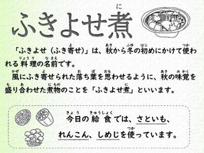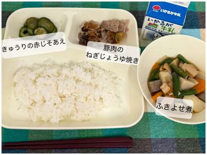 今日の献立は、豚肉のねぎじょうゆ焼き、ふきよせ煮、きゅうりの赤じそあえ、ごはん、牛乳です。
