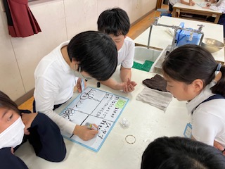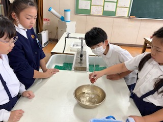 4年理科では、「ものの温度と体積」を学習しています。最初の実験は空気を湯で温めたり、氷水で冷やしたりして、フラスコの中の空気の体積の変化を調べます。理科室での実験は初めてでしたが、理科室での約束を守り、安全に実験ができ、班員と協力して学習に取り組んでいました。また、結果から考えたことを話し合ってまとめてボードに書き発表して交流しました。