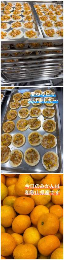 今日の献立は、豚肉と野菜のスープ煮、変わりピザ、みかん、コッペパン、いちごジャム、 牛乳です。