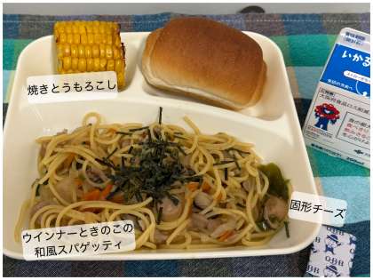 今日の献立は、ウインナーときのこの和風スパゲッティ、焼きとうもろこし、固形チーズ、ミニコッペパン、牛乳です。