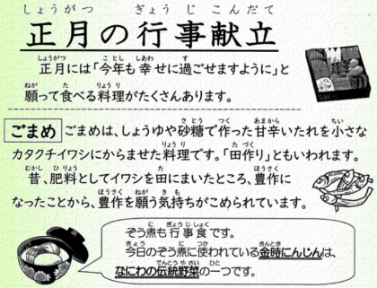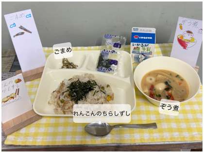 今日の献立は、れんこんのちらしずし、 ぞう煮、ごまめ、牛乳です。