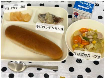 今日の献立は、あじのレモンマリネ、てぼ豆のスープ煮、白桃 (カット缶)、 黒糖パン、 牛乳です。