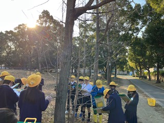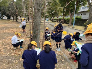 4年理科の「冬の生きもの」の学習で、三国本町公園にフィールドワークに行きました。1年を通して観察していいるイチョウを観察しに行きました。冬になって、枝には葉がないですが、冬芽がついていました。冬芽も雄の木の方とメスの木の方では芽の形が違うのを見つけたり、芽を触ると硬かったり、子どもたちは、色々な発見をしました。