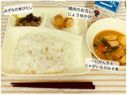 今日の献立は、鶏肉のおろしじょうゆかけ、一口がんもとじゃがいものみそ煮、みずなの煮びたし、 ごはん 牛乳です。