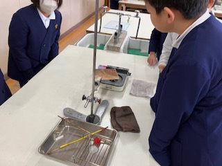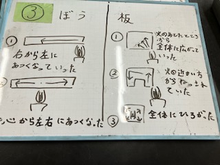 4年理科の「もののあたたまり方」では、金属や水、空気の3種類のあたたまり方を実験をして調べます。今回は、金属(棒と板)のあたたまり方を調べました。久しぶりの理科室での実験でしたが、45分の中で班で協力して準備や実験、結果からの考察、片付けまででき素晴らしいです。ホワイトボードを使ってまとめて、全員が言えるように練習して発表もしました。