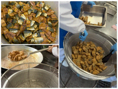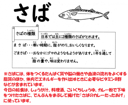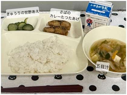 今日の献立は、さばのカレーたつたあげ、 五目汁、きゅうりの甘酢あえ、ごはん、牛乳です。