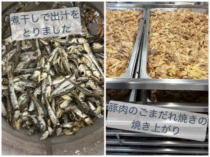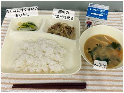 今日の献立は、豚肉のごまだれ焼き、みそ汁、きくなとはくさいのおひたし、ごはん、牛乳です。