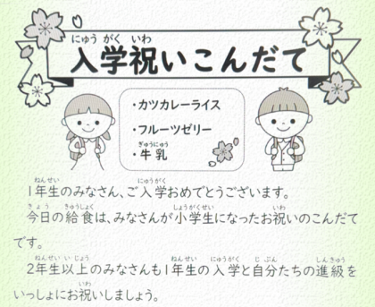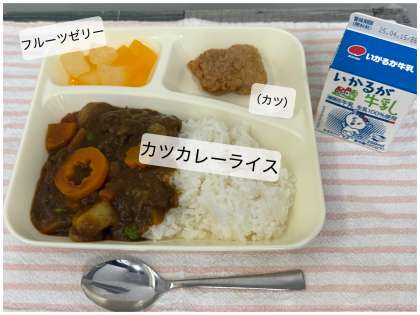 今日の献立は、カツカレーライス(カツ) カツカレーライス(カレー) フルーツゼリー、牛乳です。