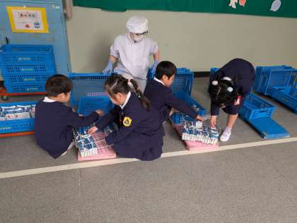 6年生の給食担当さんが、慣れた手つきで牛乳のかごを交換します。