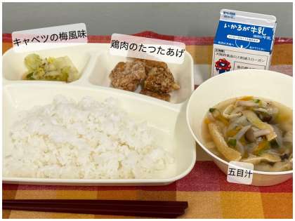 今日の献立は、鶏肉のたったあげ、五目汁、キャベツの梅風味、 ごはん、 牛乳です。
