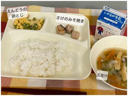 今日の献立は、さけのみそ焼き、 五目汁、 えんどうの卵とじ、ごはん 牛乳です。