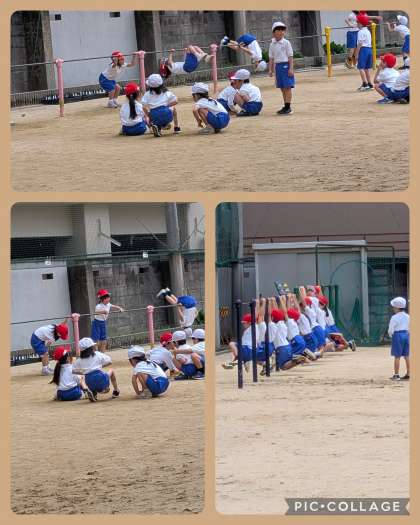 てつぼうの練習です。みんな並んで鉄棒にぶら下がったり、あっという間に前回りをしていました。