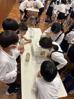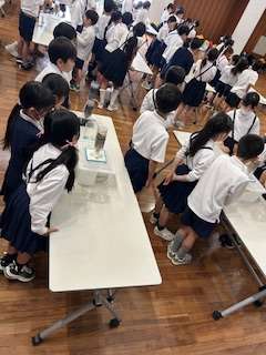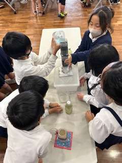 砂ろ過のセットを使って実際の淀川の水をきれいにする実験を行いました。