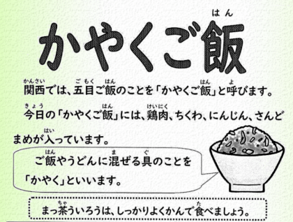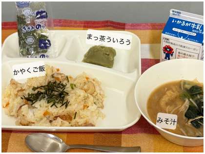今日の献立は、かやくご飯、みそ汁、 まっ茶ういろう、牛乳です。