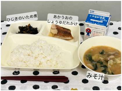 今日の献立は、あかうおのしょうゆだれかけ、みそ汁、ひじきのいため煮、ごはん、 牛乳です。