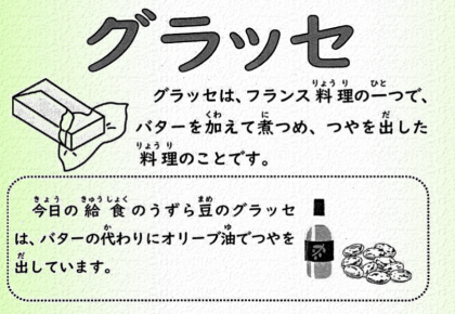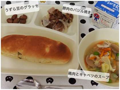 今日の献立は、豚肉のバジル焼き、 鶏肉とキャベツのスープ、 うずら豆のグラッセ、おさつパン、牛乳です。